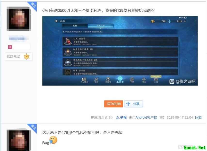 除此之外游戏还有许多恶性充值BUG。例如买138的礼包,送的是178礼包;充30元档位,会多赠送一发十连(本是10元限购的奖励)。
