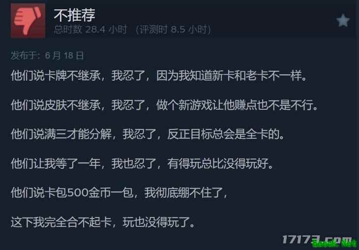 这些改动都让普通玩家极难构建出自己想玩的卡组,完全追不上氪佬的进度。现在的匹配对局,变成了只有初始卡组的“原始人”对战氪佬。