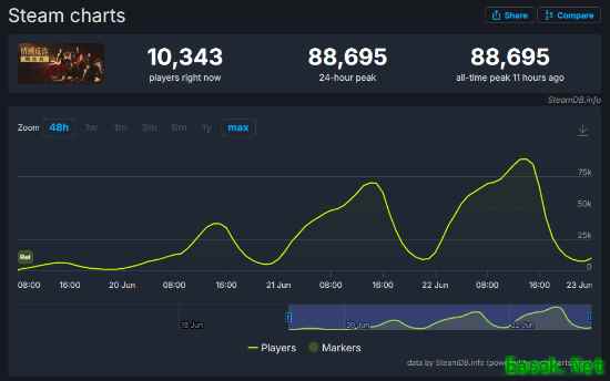 >Steam商店页面>>> 根据SteamDB数据显示,本作在昨日下午迎来刷新游戏Steam在线人数峰值,来到了88695人! >