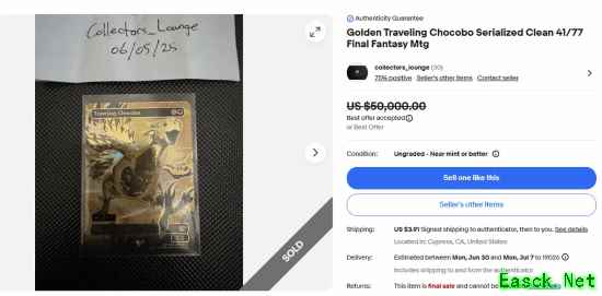 据了解,这次联动仅推出了77张金色“旅行陆行鸟卡”,且每张都有独特的编号。近日,其中一张编号为41/77的卡在eBay上被挂牌出售,起初售价高达20万美元,后调降至5万美元,并最终成交。据第三方估价工具推测,实际成交价可能在4万美元左右。 按照这一价格推算,若全套77张金色陆行鸟卡均以类似价格成交,总价值将超过308万美元。 >