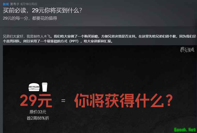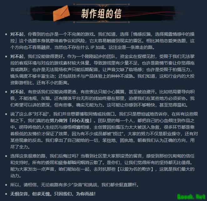 但在Steam平台,就完全是另一幅光景了。 在游戏发售的当天,制作人的一篇《买前必读》引起了广大男玩家的共鸣,游戏里的“互助留言板”也成了大家倾诉“被捞”经历的网络树洞。 游戏里里外外都透着一股“为男性同胞发声”的味道,于是,游戏发售后很快在Steam上收获了“好评如潮”。