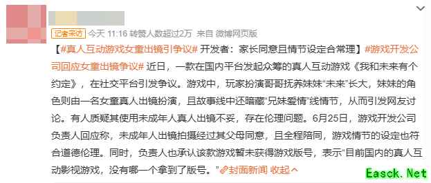 游戏曝光后不久,网上舆论就炸锅了。有人质疑其使用未成年人真人出镜不妥,存在伦理问题。 游戏负责人出来澄清,表示未成年人出镜拍摄已经过其父母同意,且全程陪同,游戏情节的设定也符合道德伦理。