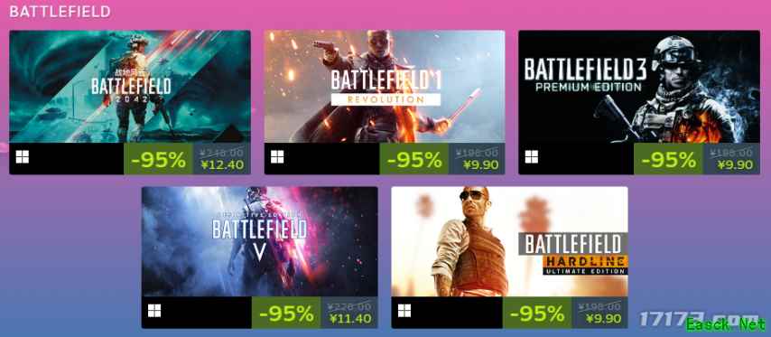 那么这次Steam夏促有哪些值得购买的作品呢?今天就让我们一起来看一看吧。 0.5折的神!(-95%) 这跟不要钱有什么区别! -95%的折扣,在Steam可以说是除了白给最好的优惠了,打出这个标签,哪怕几百块的3A大作,也就只需个位数拿下。 EA旗下的战地系列可以说是在这次夏促里最有诚意的,战地系列全线作品都是-95%的超级折扣。