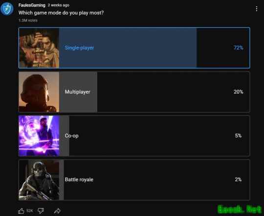 对于玩家来说,超70%更喜欢单人游戏这一偏好调查结果的影响可能主要体现在以下几个方面: 1. 社交需求:对于许多人来说,多人游戏可以提供一种社交体验,与朋友和家人一起参与游戏。然而,这个调查结果可能意味着许多玩家更倾向于选择那些可以独自享受的游戏,而不是那些需要与其他人互动的游戏。 2. 游戏选择:这个调查结果可能会影响玩家在选择游戏时的偏好。对于那些喜欢独自享受游戏的人来说,他们可能会更倾向于选择那些单人游戏,而不太愿意参与多人游戏。 3. 游戏开发:这个调查结果可能会对游戏开发产生影响。许多游戏开发者可能会考虑将更多的精力投入到单人游戏开发中,以满足这部分玩家的需求。 4. 玩家体验:超70%的玩家更喜欢单人游戏可能会影响玩家的游戏体验。对于那些喜欢独自享受游戏的人来说,他们可能会更专注于游戏的剧情和深度,而不太关注与其他玩家的互动。 总的来说,这个调查结果可能会对玩家、游戏开发者以及整个游戏行业产生深远的影响。不过,具体的影响还需要考虑许多其他因素,如玩家的年龄、性别、游戏类型等。 长期以来,关于单人游戏与多人游戏孰更受欢迎、玩家偏好如何的讨论一直存在。尽管多人游戏拥有庞大的日常玩家群体,但多项数据显示,单人游戏似乎覆盖了更广泛的玩家基础。 近期一项由FaulesGaming发起的大型投票为此提供了有力佐证。该投票吸引了超过130万名玩家参与,询问其最常游玩的游戏模式。结果显示: 绝大多数票数(约72%)投给了单人游戏。 多人模式获得约20%的票数。 合作模式(Co-op)约占5%。 大逃杀模式(Battle Royale)仅占约2%。