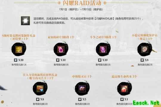 在7月1日维护后至7月15日维护前,英雄们完成主线RAID战役,可从战役掉落中获得“闪耀RAID礼券”(角色每周可获得25个),礼券可在兑换商店兑换S级克隆时装制作礼盒(补给型)、未知的碎片3阶段、斗争之碎片3阶段等奖励!