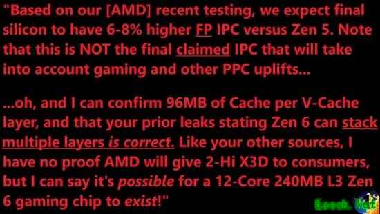 除了IPC提升,Zen 6架构还将引入更多的3D V-Cache缓存技术,MLID的消息源确认,Zen 6将配备96MB的3D V-Cache,并且支持多层3D V-Cache堆叠。 这意味着如果AMD采用两层3D V-Cache,那么Zen 6 CPU的L3缓存容量可能会达到240MB。 此外,Zen 6架构还预计将带来更高的核心频率和更多的核心数量,结合先进的台积电制程工艺,这将使其在性能上更具竞争力。 不过需要注意的是, 这些信息在AMD正式公布Zen 6之前都处于未经证实状态,Zen 6还有一年或更长时间才会推出,这意味着AMD不太可能在短期内透露任何具体信息。