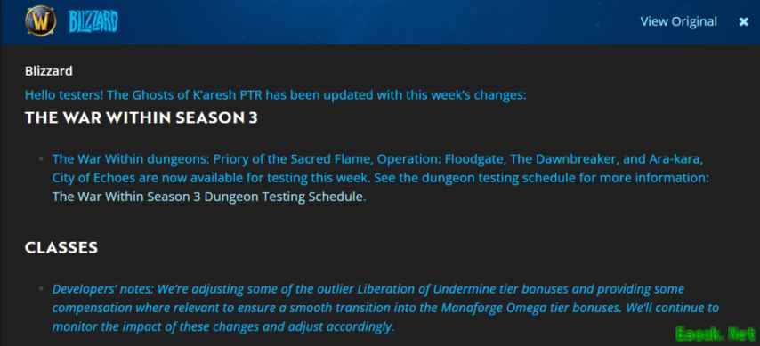 开发者说明我们调整了一些「安德麦解放」套装中表现异常的加成,并在需要的地方提供补偿,以确保平稳过渡到「熔炉欧米伽」套装。我们会继续监控影响并适时调整。 死亡骑士英雄天赋死亡使者 死亡印记伤害提高30%。 献血破灭已更新:第一次挥击现在必定触发2秒的骨灵风暴。 冰霜黑暗束缚现在消耗凛风冲击时对主目标的伤害提高60%(原30%)。 天启骑士:渊誓使死亡凋零冷却时间缩短效果为5秒(原10秒)。 莫格莱尼之力已更新:在莫格莱尼的死亡凋零中伤害提高5%,暴击几率提高5%。 血之精魂 内脏之力增加新效果:血液沸腾命中2个或以上目标时生成1层骨盾。 冰霜(技能更新) 冰龙之息:施法8秒,每秒对前方锥形范围内造成冰霜伤害。消耗杀戮机器或凛风使持续时间延长1秒。对次级目标伤害降低。开始时获得1层符文武器增效,结束时恢复2个符文。冷却1.5分钟,消耗60符文能量。 开发者说明近期将冰龙息改成引导法术的尝试引发了大量反馈。部分玩家喜欢新方向,但很多人认为施法要求破坏了冰DK的循环流畅度。我们现在调整为更自然的版本,同时保留标志性的强大效果。 死亡之握在PvP外冷却时间为15秒(原25秒)。 杀戮连击消耗2层杀戮机器时,冰河突进现在会正确造成双倍伤害并施加2层锐冰。 修复冰霜灾祸未触发凛风的问题。 修复极地突袭有时未触发杀戮机器的问题。 杀戮连击正确赋予2层碎骨机。 修复聚集风暴在点出冰封领域时未延长无情之冬的问题。 凶残效率和嚎刃位置互换。 霜镰视觉效果更新。 邪恶亵渎已更新:死亡凋零伤害提高100%,冷却缩短10秒,施放后替换为亵渎。 亵渎:吞噬死亡凋零,瞬间造成其剩余伤害的100%。若目标有溃烂之伤则引爆1–2层。享受站在死亡凋零中的加成。 开发者说明之前亵渎伤害高于死亡凋零本身,导致玩家必须立即释放。我们希望增加灵活性,同时保留其强力定位。 死亡凋零伤害提高100%(不影响亵渎)。 溃烂脓疮伤害提高15%。 溃烂脓疮现在可命中最多7个附近目标。 亵渎冷却30秒(原20秒)。 死亡之握在PvP外冷却时间为15秒(原25秒)。 引爆溃烂之伤会刷新溃烂镰刀替代光环持续时间。 痛击打击暴击时引爆的溃烂之伤造成20%额外伤害,也影响溃烂脓疮的伤害。 突如其来不再降低疫病爆发的符文能量消耗(原-10)。 开发者说明降低疫病爆发消耗导致邪DK在AoE下资源过多。 坟墓精通现在提高石像鬼与灵魂军团的暴击伤害。 瘟疫精通现在提高溃烂之伤的暴击伤害。 修复黑暗变形未升级食尸鬼爪击等技能的问题。 德鲁伊英雄天赋利爪德鲁伊 强化变形现在使熊形态受到的魔法伤害降低6%(原4%)。 熔炉欧米伽套装 4件加成触发的掠夺若当时血爪或蓄势待发,也会受其加成。自动掠夺不会消耗血爪或蓄势待发的层数。 开发者说明自动掠夺不享受利齿之颚加成是设计意图,我们不希望那个天赋成为套装最大化的必选。 野性 修复4件自动掠夺在利齿之颚天赋下伤害异常的问题。 守护 可怕创伤使敌人对你造成的伤害降低效果提高至15%(原10%)。 直击要害:裂伤为你治疗5%最大生命值(原1%)。 野性追猎者 共生绽放与爆裂生长治疗提高30%(原50%)。 恢复 2件加成:共生绽放生长速度提高30%(原40%)。 4件加成:共生绽放每2秒有20%几率以80%效果触发爆裂生长(原100%)。 唤魔师英雄天赋塑焰者 恩护 法力熔炉欧米伽2件加成:心灵之火每层提高的周期性治疗量调整为25%(原40%)。 法力熔炉欧米伽4件加成:治疗版精华炸弹的半径增加到20码(原8码)。 湮灭 所有造成的伤害提高3%。 安德麦解放2件加成更新:头奖现在以50%效果施放粉碎之星(原100%),触发频率降低20%。 安德麦解放4件加成更新:粉碎之星和头奖现在每层提高下一个充能法术的伤害18%(原25%)。 恩护 所有治疗量降低4%。 梦境吐息治疗量降低20%。 时光工匠现在将倒转的冷却缩短120秒(原90秒)。 修复了生命之缚无法转移碧绿圣约治疗量(当唤魔师身上有治疗吸收效果时)的错误。 猎人英雄天赋黑暗游侠 饮魂者调整:黑箭伤害加成降低至8%(原15%),黯然火药伤害加成降低至10%(原20%)。 幻痛分摊伤害比例降低至15%。 幻痛分摊现在可作用最多8个目标。 黯然火药伤害降低25%。 射击黑箭伤害降低8%。 群狼领袖 龟壳庇护更新:当生命值低于60%时召唤乌龟协助,减少受到的伤害15%。生命值越低,伤害减免越高,最低10%血时最多35%减伤。每90秒触发一次。 强强联手更新:宠物造成的伤害提高5/15%;狂乱攻速加成提高4%;利刃之矛伤害加成提高10%。 撕裂之肉伤害降低30%。 开发者说明出血技能无视护甲,而之前撕裂之肉未做到这一点,此次调整旨在维持大致平衡。 头狼嚎声现在会在兽群召唤可用时显示激活提示。 头狼熊现在正确获得宠物闪避效果。 修复撕裂之肉未被视为流血效果的问题。 法力熔炉欧米伽4件加成更新: 现在仅在「身先士卒」期间召唤野兽时触发践踏。 群兽奔腾伤害降低50%。 群兽奔腾现在每只猛冲的野兽最多命中8个目标。 群兽奔腾伤害半径增加。 群兽奔腾路径逻辑更新。 群兽奔腾视觉效果更新。 技能描述更新以显示更准确的伤害值。 开发者说明群兽奔腾的方向要求在你无法预知何时触发时很难最大化。我们降低了其伤害,但让它更易使用、更宽容,并提供更清楚的触发窗口。 修复践踏在命中5个目标后消失的问题。 哨兵 修复欧米伽4件加成给的艾露恩之赐会和2件的艾露恩之赐重