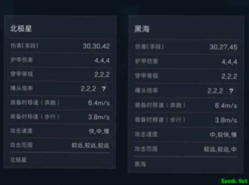 北极星和黑海一样的首刀30伤害搭配上2倍的爆头倍率,可以一刀秒杀掉4级头盾哥、两刀秒杀赛伊德,刚出就直接登上近战武器一哥位置。黑海对比北极星唯一优势就是劈砍范围大了,但是黑海视野遮挡问题很严重,不像小刀几乎不遮挡视野。
