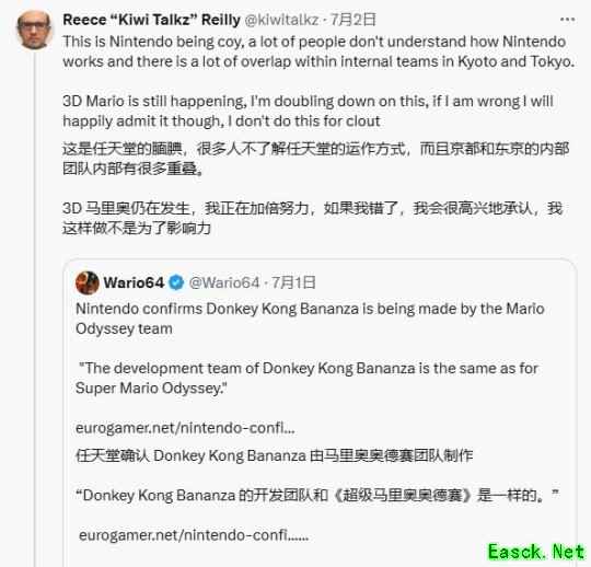 这一消息来自YouTube频道Kiwi Talkz,该频道此前曾准确爆料过上述《咚奇刚:蕉力全开》的相关信息。据消息源透露,在开发《咚奇刚》新作的同时,任天堂另有一个团队正在开发全新的3D马里奥游戏。 “这是任天堂惯用的障眼法,”这位爆料人在转发《咚奇刚:蕉力全开》由《奥德赛》团队制作的帖子时解释道,“很多人不了解任天堂的运作方式,京都和东京的内部团队之间存在大量人员重叠。3D马里奥新作确实在开发中,我对此非常肯定。如果我说错了,我会坦然承认——我做爆料不是为了博关注。我的消息源在幕后告诉我的所有事情从未出错,这就是我如此自信的原因。”