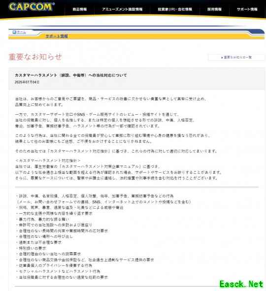 重要通知 关于“顾客骚扰行为(如诽谤、中伤等)”的应对措施 发布日期:2025年7月4日 本公司始终将客户的意见与建议视为宝贵资源,认真倾听,并积极应用于商品和服务的改进,致力于持续提升整体品质。 然而,近期我们在客户支持窗口、社交媒体、游戏销售平台的评论区及各类投稿网站上,发现部分针对本公司员工的言语攻击行为,包括公开点名或影射特定人员的诽谤、中伤、人格否定、威胁、施暴预告、妨碍业务预告等骚扰言行。 此类行为不仅严重影响相关员工的身心健康与工作环境,也可能对其他客户的服务体验造成不利影响。 为保障全体员工的工作安全与尊严,同时维持良好的服务秩序,本公司将依据《顾客骚扰行为应对指针》,对该类行为予以坚决应对。 顾客骚扰行为应对指针 本公司参照日本厚生劳动省发布的《顾客骚扰对策企业手册》,明确以下超出社会通念、难以接受的行为。一旦确认存在此类行为,我们有权中止相关客户的支持与服务。 对于情节恶劣、性质严重的个案,将依法联系警方及法律专业人士,采取法律手段,包括但不限于民事诉讼与刑事程序。 可能被视为“顾客骚扰”的行为包括但不限于: 通过邮件、咨询表单、社交媒体、网络评论等渠道,实施以下行为: ?诽谤、中伤、名誉毁损、人身攻击、人格否定、侮辱言论 ?暴力威胁、施暴预告、妨碍业务预告 恫吓、辱骂、恶言相向、过度追责、强行责备等威吓或胁迫行为 无理主张或反复提出相同内容的要求 暴力行为或有暴力倾向的举止 未经许可擅自进入本公司场所或无故滞留 非合理理由下的长时间拘束、或要求在非工作时间进行应对 要求公司员工前往不合理场所会面 明显过度或不合理的服务或赔偿要求 要求给予特殊待遇 无正当理由的公司道歉要求 要求进行不合理的商品更换、金钱补偿等超出社会常识范围的服务 侵犯员工个人隐私 性骚扰等各类骚扰行为 无合理依据,要求对员工作出过度惩处 |