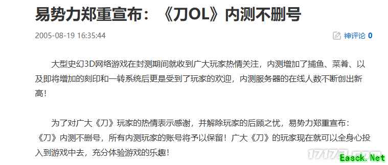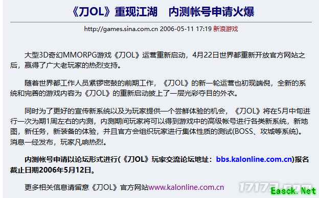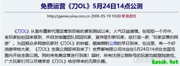 这场毫无征兆的“跑路”,不仅让无数翘首以盼的玩家梦碎,更令全国各地与之合作推广的企业措手不及,陷入巨大困境。 在上海易势力“消失”以前,《刀OL》仅架设了3台服务器,只能容纳6000人左右,运营状况堪忧。 国服代理易势力的突然撂担子,也导致了《刀OL》运营中断,而这个时间持续了近半年时间。 2006年4月,一家名为世界都的游戏公司获得《刀OL》的国服代理权,并宣布重启《刀OL》官方网站。