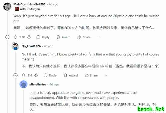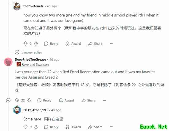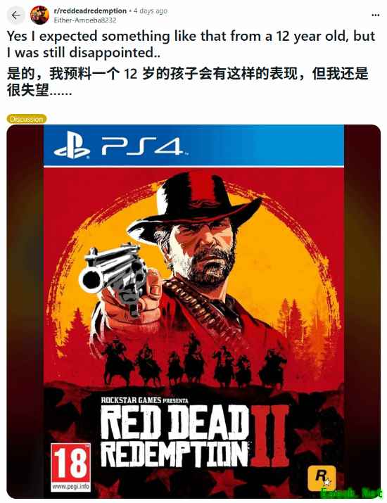 不过也有许多玩家表示,这纯粹看个人的爱好及口味,自己在12岁时就爱上了《大镖客》。