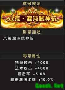 称号名称:八荒・混沌弑神斩 称号属性:物理攻击+4000,法术攻击+4000,暴击率+5.0%,暴击增伤比列+10.0% 解锁方式:参与新服累计充值活动,达到对应档位,即可领取该礼包;