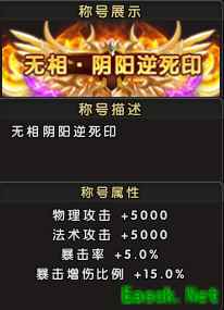称号名称:无相・阴阳逆死印 称号属性:物理攻击+5000,法术攻击+5000,暴击率+5.0%,暴击增伤比列+15.0% 解锁方式:参与新服累计充值活动,达到对应档位,即可领取该礼包;