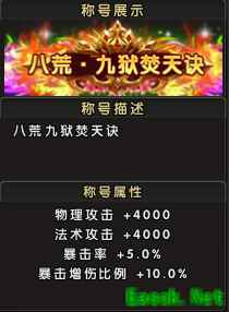 称号名称:八荒・九狱焚天诀 称号属性:物理攻击+4000,法术攻击+4000,暴击率+5.0%,暴击增伤比列+10.0% 解锁方式:参与新服累计充值活动,达到对应档位,即可领取该礼包;