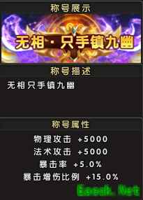 称号名称:无相・只手镇九幽 称号属性:物理攻击+5000,法术攻击+5000,暴击率+5.0%,暴击增伤比列+15.0% 解锁方式:参与新服累计充值活动,达到对应档位,即可领取该礼包;