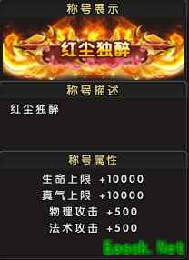 -新服专属称号 参与新服手机预约活动,即可获取新服专属称号奖励。 称号名称:红尘独醉 。 称号属性:生命+10000,真气+10000,物理攻击+500,法术攻击+500;