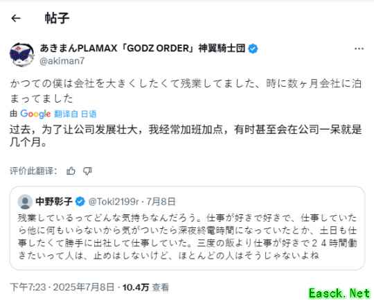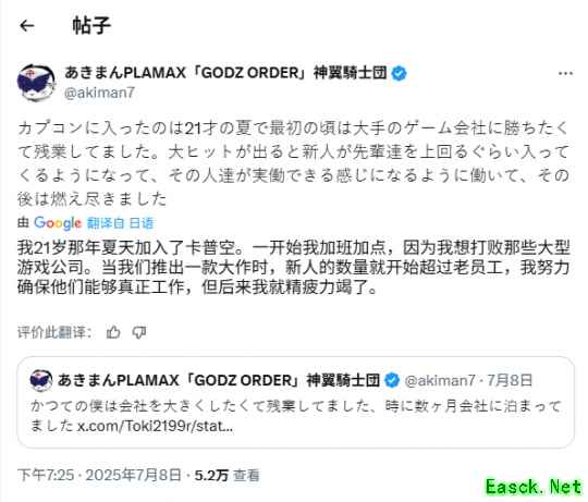 在日本职场文化中,加班早已不是新鲜事。但在创意行业中,加班并不总是由公司强迫,许多人出于自愿而选择留在公司加班。日前,一位业内动画师在X上发问:“自愿加班的感觉到底是什么样的?”对此,安田朗回应称,自己就是那种为了目标而主动加班的人,他的目标是让卡普空成长壮大,超越其他竞争对手。