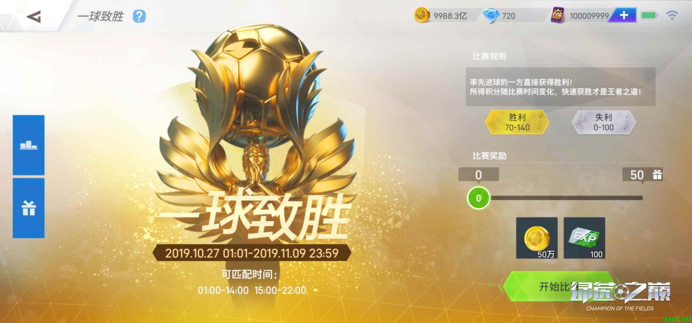 一球致胜 胜负就在一瞬间 资深球迷应该知道,世界足联曾在20世纪末推行过一种“金球制”的规则,即当比赛进入加时赛阶段时,先进球的一方获胜,比赛也随即结束。虽然“金球制”后来被更加合理的“银球制”所取代,但一球致胜时刻还是给众多球迷留下深刻印象。《绿茵之巅》将重现这一紧张刺激的赛制,并且更加疯狂。 一球致胜赛事将在每天的12:00-14:00和19:00-22:00限时开放,比赛一旦开始,只要任何一方玩家首先进球则可以直接取得比赛胜利,比赛也会随即结束。因此,从开场哨声吹响的那一刻起,你就必须好好把握每次进攻机会,做好每一个防守回合。 要赢更要快 快速进球才是致胜之道 作为限时开放的特色玩法,一球致胜同样提供了丰厚的奖励。在赛事中达到相应积分,即可获得经验卡与金币奖励。经验卡与金币都可用于培养球员,提升球员等级。 一球致胜赛规则不会产生平局的情况,胜利和失败都会有相应的积分奖励,但显然,作为胜利者走出球场,不仅更令人激动,获得积分也会更多。并且,获取的积分将会随着比赛时长而变化。胜利的一方如果花费的时间足够短,那么将可以获得满额的140积分;而假如花费的时间过长,即使获得比赛的胜利,所获取的积分也会少很多。失利一方虽然也能获得积分,但如果在非常短的时间内输掉比赛,获得的积分将会很少甚至不能获得积分。因此,当场面实在对自己不利时,通过坚守拖住对手,通过时间长度赢取更多失利积分,也不失为一个好的方法。