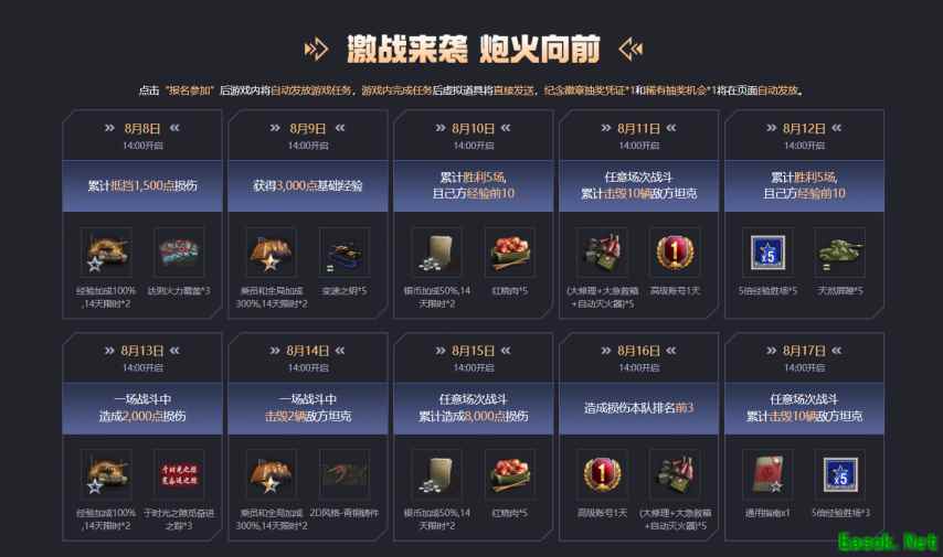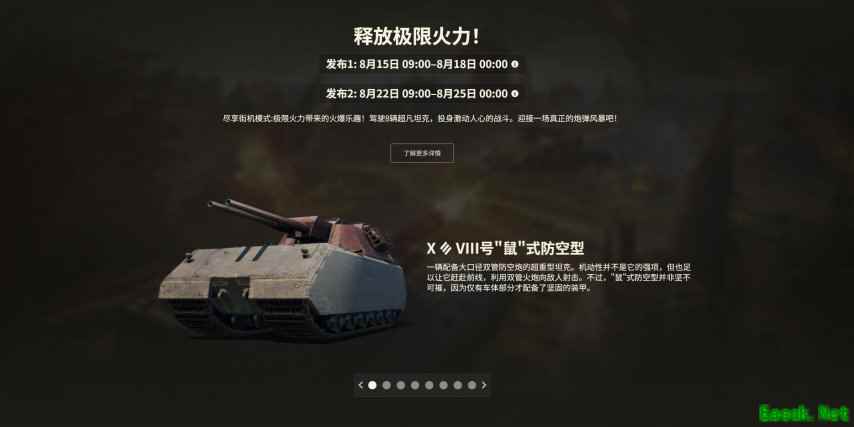 ·“极限火力”模式 此外,“极限火力”模式将在8月15日至24日的两个周末限时回归。驾驶8辆超凡坦克,投身激动人心的战斗,迎接一场真正的炮弹风暴吧!