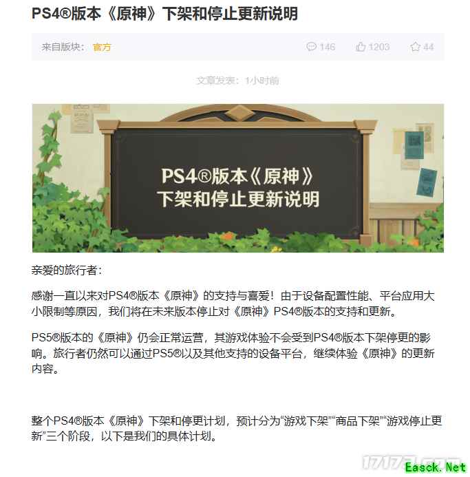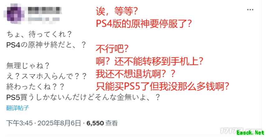 只能说,雷火运营这个“反内卷”的出发点是好的,但能不能做到“反内卷”? 除了严打GZS之外,最大的问题还是出在暴雪为了难而难的大秘境跟团本设计,以及目前游戏内卷的社交环境上,要是普通玩家能冲高层,能打M团本,也没必要找代练。 “原神停运”登上外网热搜,日本玩家哭了 8月6日,《原神》官方发布信息,称将逐步停止对PS4版游戏的支持,直至明年4月8日停服。这主要的是因为PS4的性能较为落后,无法支持游戏流畅运行,米哈游也是无奈了。