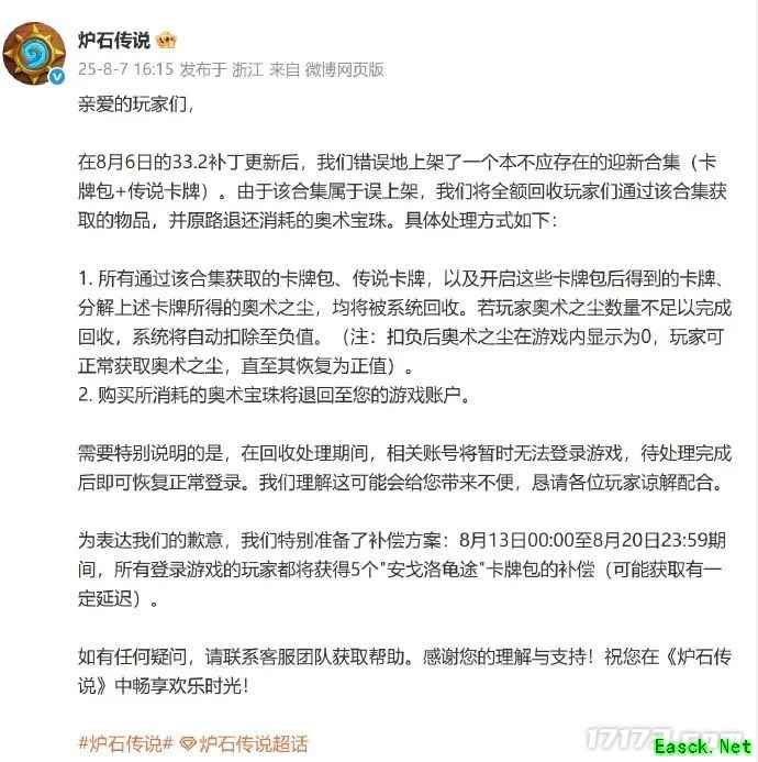 事后,《炉石传说》官方发布了针对BUG的处理方案,全服玩家每人将获得5卡包的补偿,而对于利用BUG获取不当利益的玩家,其所得物品将被全额回收,并原路退回奥术宝珠。