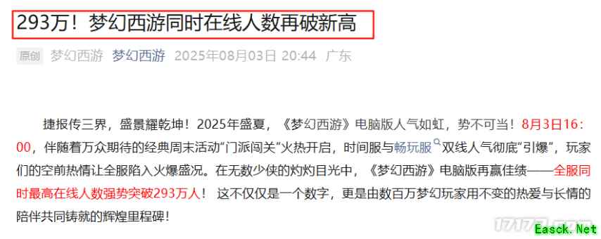 大家周末好,这里是怀旧周报。 【怀旧周报】主要由“热门怀旧游戏动态”、“怀旧游戏新作”两个部分组成。 就让我们一起来看看本周有哪些值得关注的内容吧! 【热门怀旧游戏动态】 同时在线293万!《梦幻西游》电脑版人气再创新高 8月3日,《梦幻西游》电脑版在同时在线人数突破275万的基础上,人气再创新高,达到293万之多。为此,官方特意发文,向广大玩家表达诚挚的感谢。