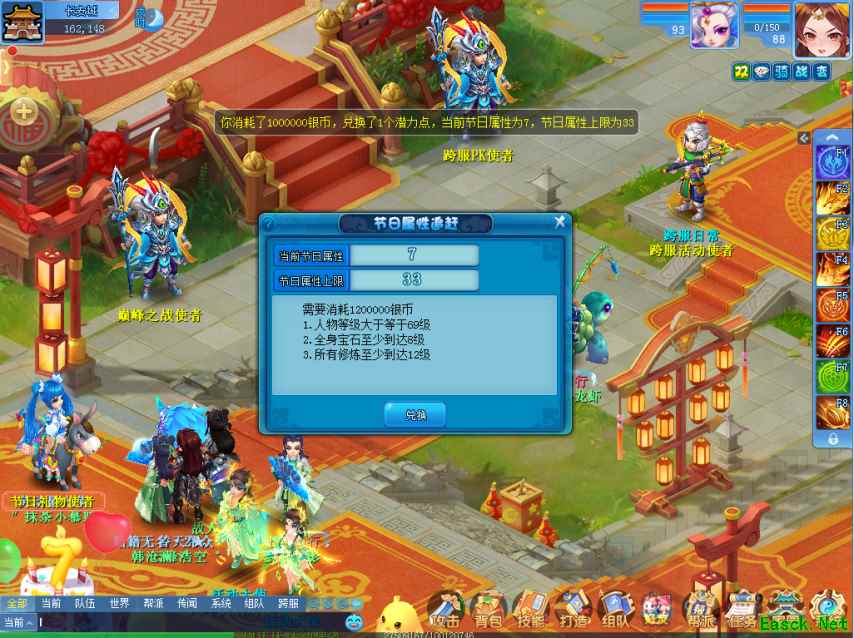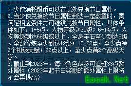 在获得了很多节日属性后,系统可能还会对你提出等级、宝石等级、修炼等级之类的要求,才能继续追赶。目前,所有少侠最多可以通过这个方式获得额外的33属性潜力点。