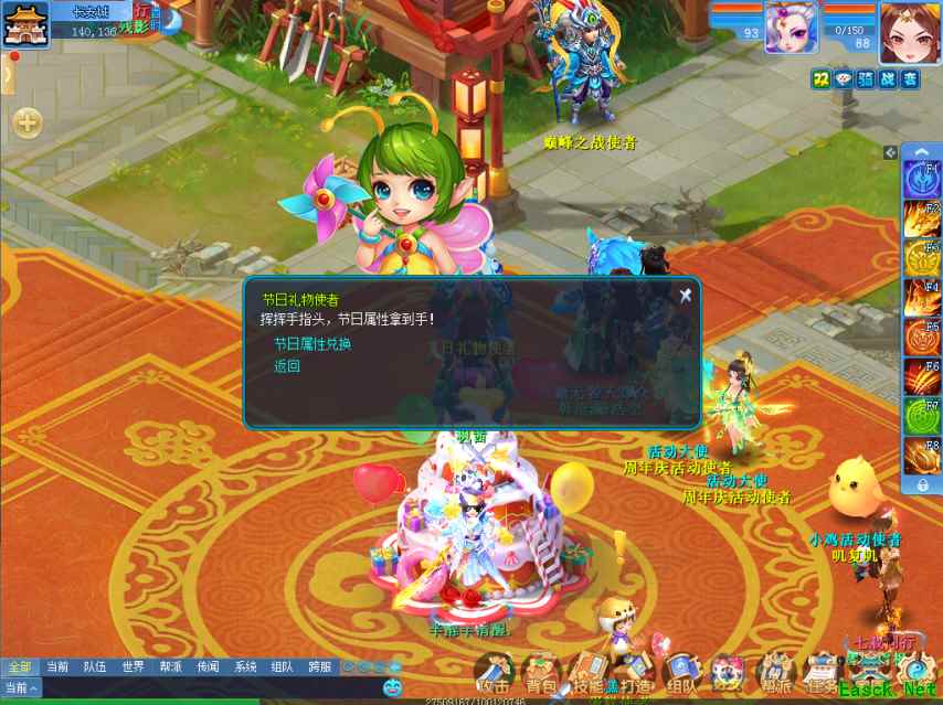 首先,我们来到长安城的广场上,找到这位小萝莉“节日礼物使者”NPC。对话后选择“节日属性追赶”就可以查看自己当前节日属性的领取状况,以及进行节日属性兑换了。