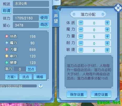 可以看出来,体质与气血、力量与攻击、魔力与法强和魔法、耐力与物防、敏捷与速度是强相关的,而法防则是一种与多项属性都弱相关的能力,除了敏捷以外的属性都会稍微提高法抗。 【保存方案 洗点重来】