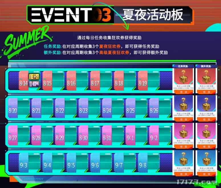 活动3:夏夜活动板,在对应周期内收集3个夏夜狂欢券即可获得幸运G-COIN宝箱(100-10000 G-COIN)(7天),若能同时收集3个高级夏夜狂欢券,还可获得额外的幸运G-COIN宝箱(10-100 G-COIN)(7天)!