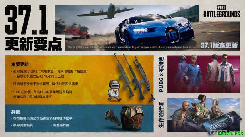 KRAFTON旗下的《PUBG: BATTLEGROUNDS》(以下简称《PUBG》)迎来了第37赛季第1轮的更新。在本次37.1正式服更新中,《PUBG》上线了全新内容,推出了与超跑汽车品牌“布加迪(BUGATTI)”的联名,扩大了用户创作功能“UGC初始版”开放范围,并且让像素风街机模式“鸡地求生”限时回归。