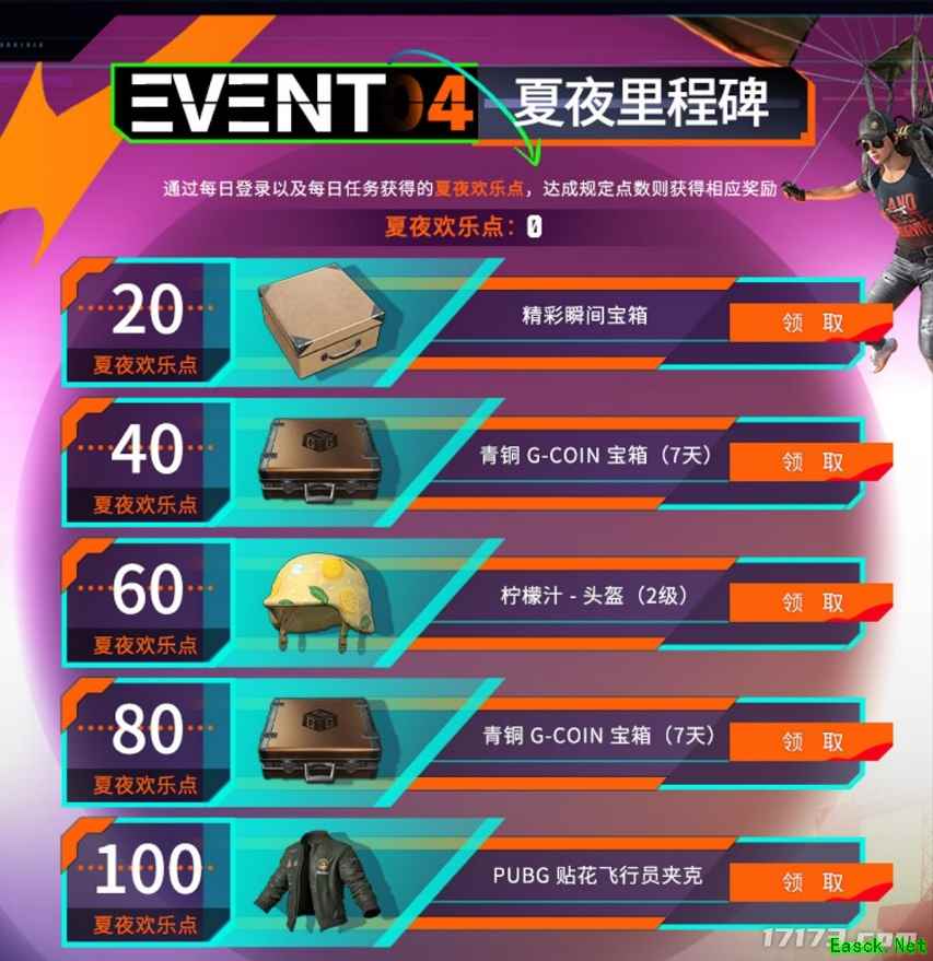 活动4:夏夜里程碑,通过每日登录及每日任务获得的夏夜欢乐点,达成规定点数就可以获得相应奖励,不仅有青铜G-COIN宝箱(7天)和柠檬汁头盔,还有最新上线的PUBG贴花飞行员夹克可以领!