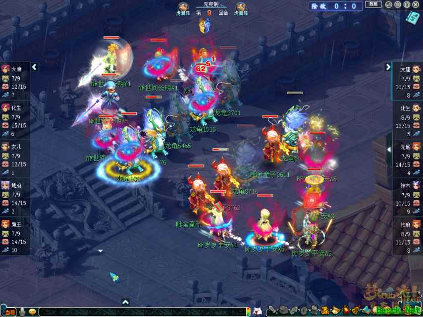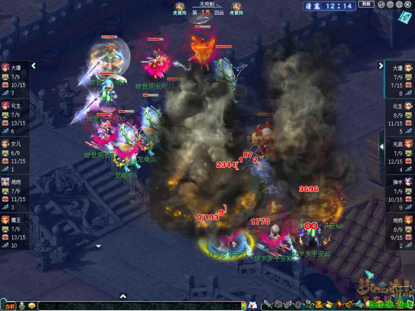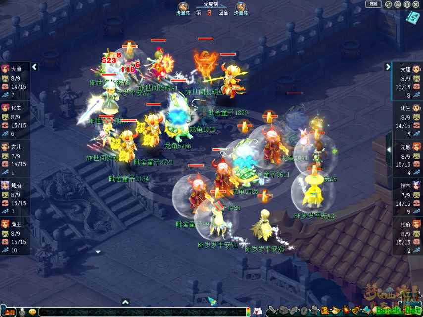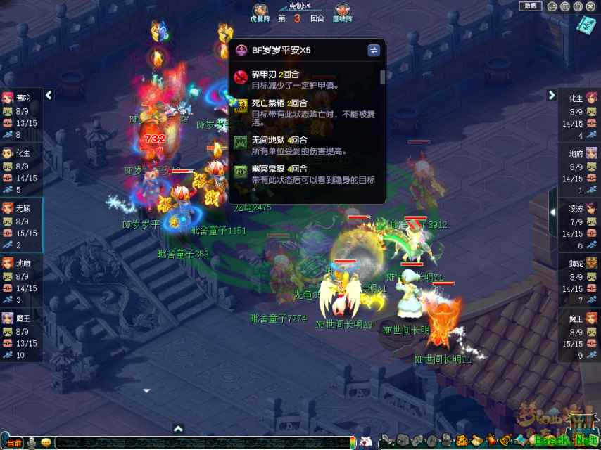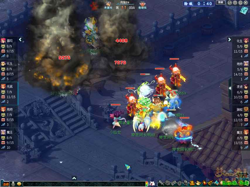 比赛第7回合,【世间长明】靠着魔王寨一波恐怖的面伤,成功压倒【岁岁平安】魔王寨的同时,还用须弥法宠补刀无底洞,成功滚起雪球。 比赛第11回合,【世间长明】火力全开,靠着狮驼、凌波、魔王的面伤输出完成清场,将比分扳平。【世间长明】再度速推【岁岁平安】,成功收下全民组冠军  在第三场比赛中,【世间长明】选用了“狮驼、化生、地府、凌波、神木”组成的“三攻”体系,【岁岁平安】则选用了“大唐、化生、地府、无底、龙宫”组成的“国标点杀”体系。 比赛前期,双方主要以清宠和加状态为主。虽说【岁岁平安】充分吸取了第一场比赛的教训,但【世间长明】并没有采用之前的套路,而是将开场隐攻换成了善恶攻宠,成功拿到清宠优势。比赛第4回合,【岁岁平安】本想通过点杀凌波城的方式缓解压力,但由于点杀目标多次触发“163”神佑,未能如愿。 比赛第6回合,【世间长明】靠着一波面伤输出成功压倒【岁岁平安】地府,有效缓解了己方防点压力。而且,【岁岁平安】此时由于召唤兽数量少的缘故,很难维持即将崩溃的战线。 比赛第7回合,【世间长明】的须弥法宠突然发力,秒出3959点伤害直接带走了【岁岁平安】化生寺。这波输出输过,【岁岁平安】基本失去了恢复能力。 比赛第8回合,【世间长明】三输出再度出手,靠着强大的面伤能力锁定比赛胜局。次回合,【世间长明】完成清场,拿下比赛胜利。小结 总的来说,【世间长明】之所以能够夺冠,主要是因为其深谙“三攻”体系的进攻之道,靠着一波又一波的面伤节奏打得【岁岁平安】猝不及防。由此可见,进攻才是最好的防守!