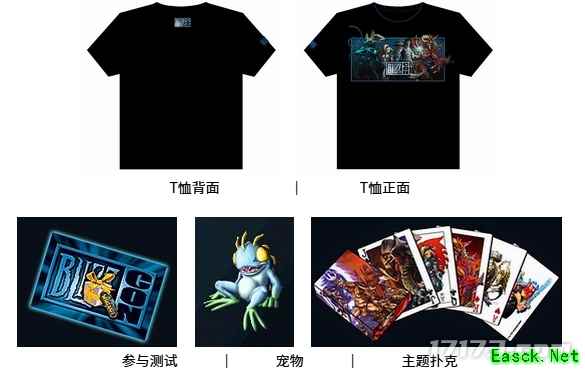 首先,最值得一提的就是这只可爱的魔兽世界游戏宠物了。身子圆圆的,身上五颜六色,大大的眼睛,大大的手指、脚趾,还爱呱呱叫。每个BlizzCon的参与者都能获得一张纪念卡,上面有一个特别编码。玩家可以在游戏中使用这个编码孵化出一只可爱的小 murloc 作为宠物。 其次就是可以获得Beta测试密码。在纪念卡上同时还会有暴雪即将到来的下次Beta测试的密码。暴雪的下次Beta测试开始时,你就可以登陆暴雪的官方网站,输入密码,注册参加。 BlizzCon T恤