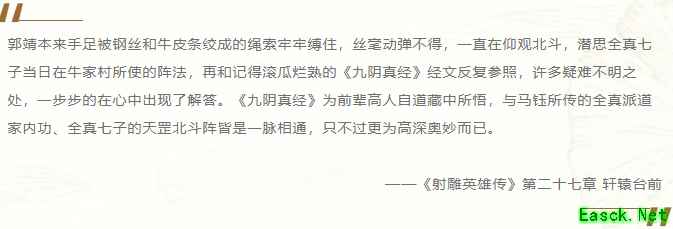 少侠可以根据背后的光环颜色判断段智兴的招式状态。每释放完一轮武学,段智兴都会唤出“逝我”与“真我”同玩家进行比斗,少侠们需要在有限的时间内击破这两位化身,否则将面临团灭的下场。 本是来终南山谈佛论道,以武会友的南帝,却意外撞上了前来拜山问道的各位少侠。如果不能掌握不同形态的招式特点,恐怕难以通过这位五绝高手的考验。 天罡北斗阵·全真七子 江湖皆知,全真教最让人闻之敬畏的,不仅仅是天下第一王重阳,还有【全真七子】和大名鼎鼎的“天罡北斗阵”。 金庸老先生原著中写道:天罡北斗阵的特点是组成阵法的侠士以北斗七星的排列进行站位,七人的真气内力宛如一体共御强敌。一代巨侠郭靖与黄蓉被困于丐帮大会之时,曾悟出其武功内核与江湖人士无不觊觎的“九阴真经”,有着不少的相通之处。