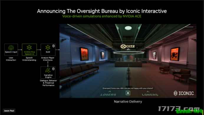 更多RTX技术涌现,《头号玩家》不再是梦 在本届科隆游戏展上,一些新作不止在画质上取得了飞跃,还借助前沿 RTX 技术,想要重新定义玩家与虚拟世界的交互方式。 比如解密新作《The Oversight Bureau》就借助NVIDIA ACE技术,给玩家们画了一张类似于《头号玩家》概念的大饼。