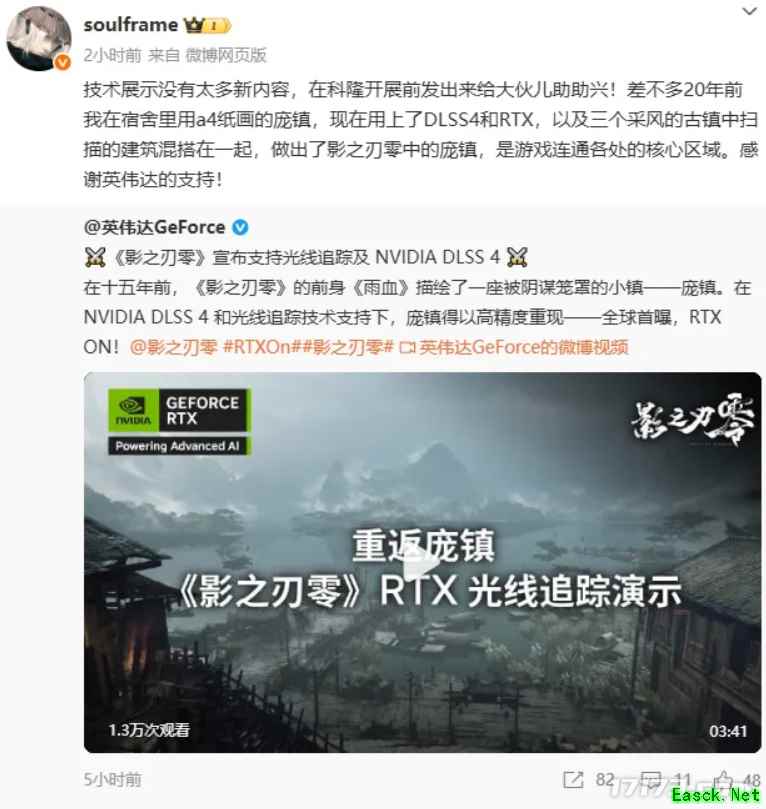 就拿“村里第二个大学生”的《影之刃零》来说,其开发者梁其伟就点名感谢了NVIDIA DLSS 4和光线追踪的支持,让他20年前在大学宿舍里用A4纸手绘的庞镇,终于以高精度、高沉浸的方式,呈现在全球玩家眼前。