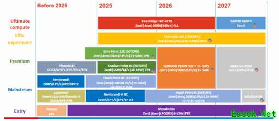 从这份路线图上看,AMD处理器在移动端似乎并不着急,节奏没那么快,可能会让一些玩家有点失望。 AMD今年初已经确认了Gorgon Point的名字,这是下一代产品,但它依然是Zen5架构,基本上就是Strix Point的升级版,CPU/GPU/NPU核心数都不变,可能会提升频率,或命名为锐龙AI 400系列。 高端领域在整个2026年都没有新品,依然是Fire Range锐龙HX 9000系列、Strix Halo锐龙AI MAX 300系列,后者甚至横跨整个2027年。 这似乎验证了此前的传闻,Medusa Halo被取消了…… 2027年初,旗舰游戏本迎来Gator Range,主流笔记本则迎来Medusa Point,都升级为Zen6 CPU架构,后者还是3nm,但是GPU架构暂时不确定,不一定是RDNA4。 低端领域将在2027年中升级到Zen6,而入门级还是2024年发布的Zen2架构的Mendocino,将至少用到2027年底。
