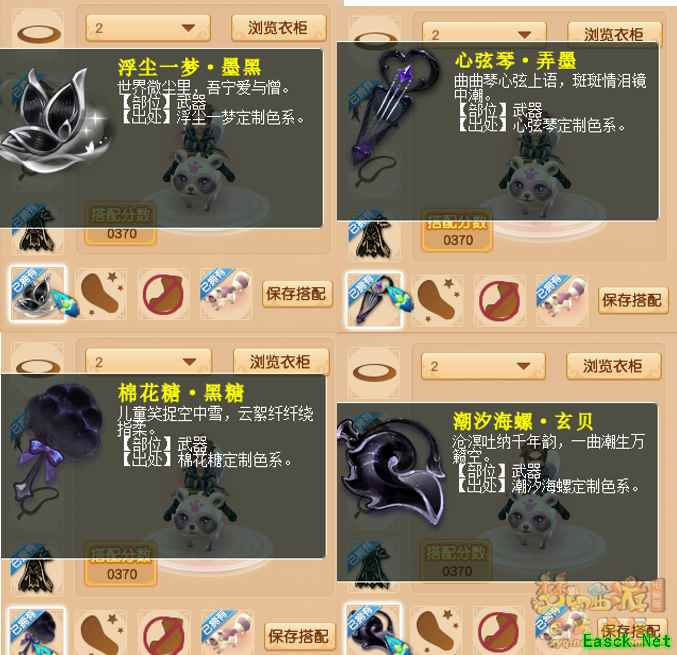 2.武器:浮沉一梦·墨黑/心弦琴·弄墨/棉花糖·黑糖/潮汐海螺·玄贝 。