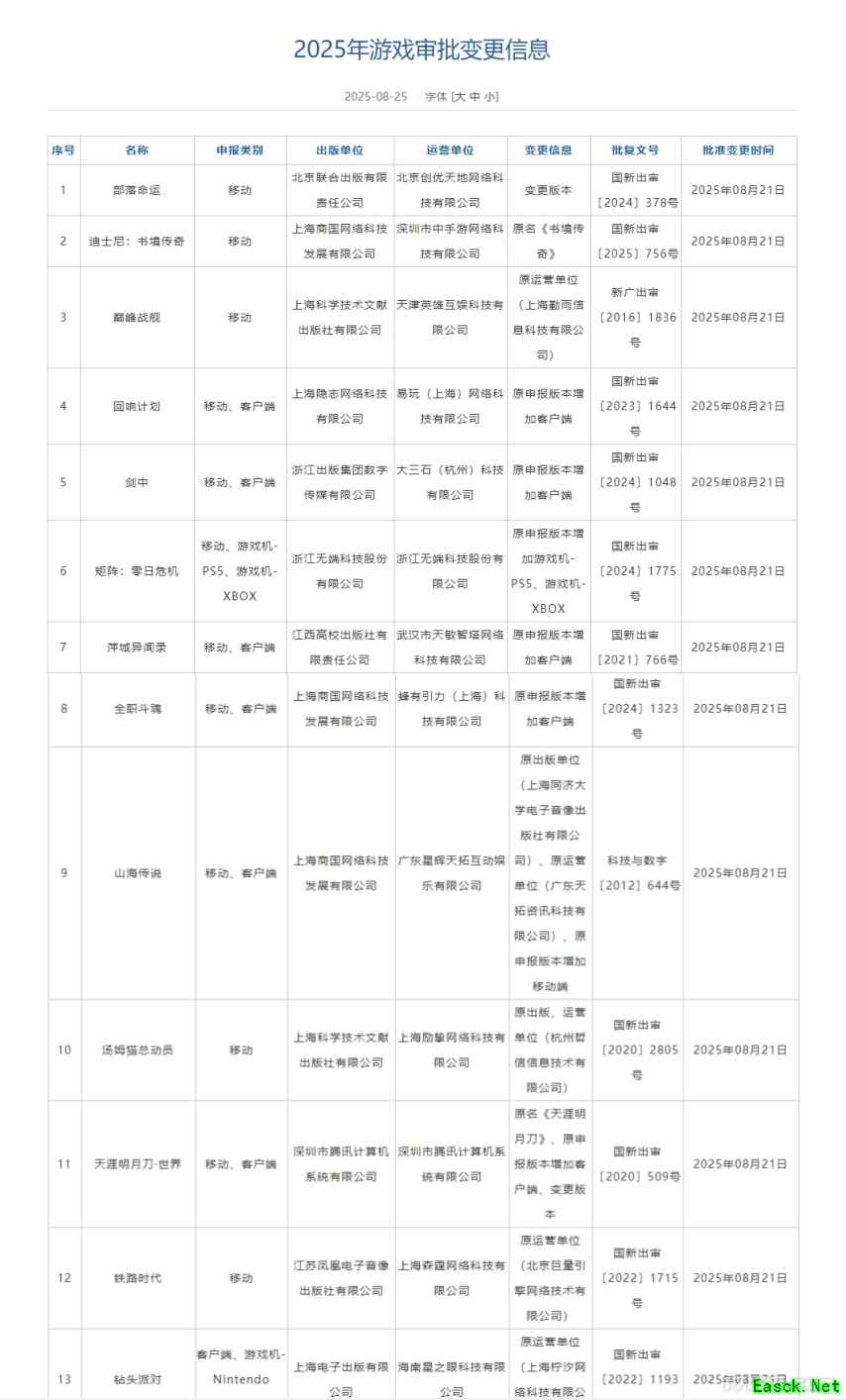 除此之外,在本次游戏版号相关信息中,还有9款游戏申请了审批信息变更,包括腾讯《天涯明月刀·世界》增加客户端、变更版本;《迪士尼:书境传奇》更名;《矩阵:零日危机》增加主机端等。