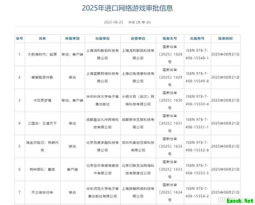 8月25日,国家新闻出版署公布了8月游戏版号审批情况,总计166款国产游戏、7款进口游戏过审,13款游戏变更信息。 其中有多款重点产品过审,包括网易《天下:万象》、胖布丁《边缘空间》、B站《逃离鸭科夫》、雷霆网络《出动吧!库鲁》、益世界《九州百业录》、厦门游力《霓虹深渊2》、游卡《三国杀:智定乾坤》、4399《弹弹小队》等。 进口版号中,B站的《嘟嘟脸恶作剧》、上海鸿利《大航海时代:起源》、小明太极《卡厄思梦境》等7款进口游戏过审。