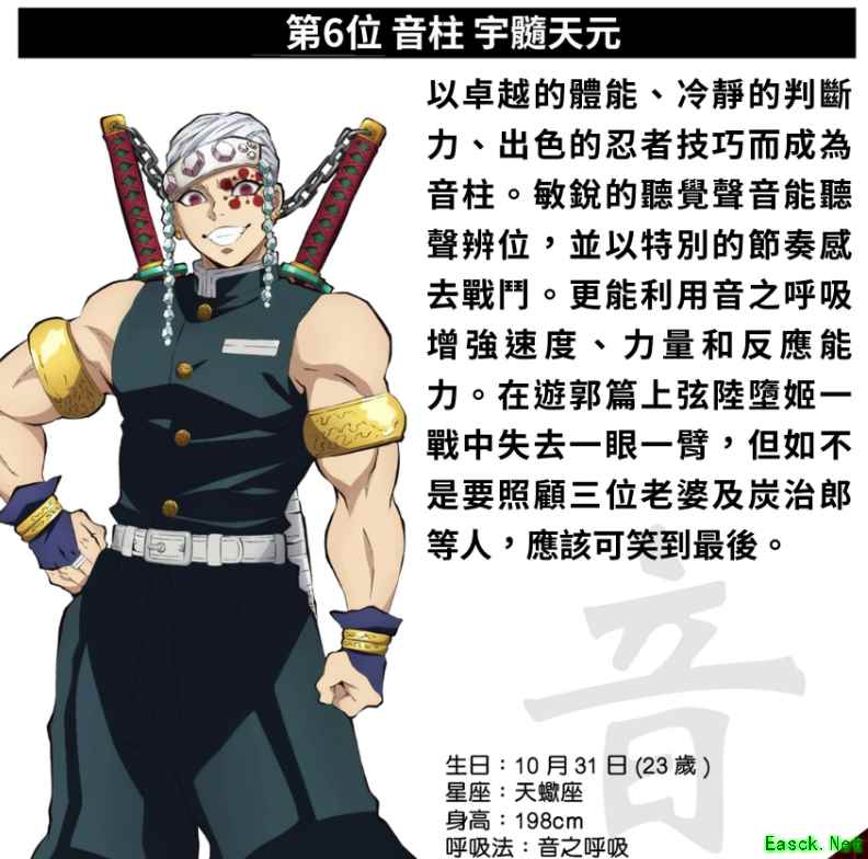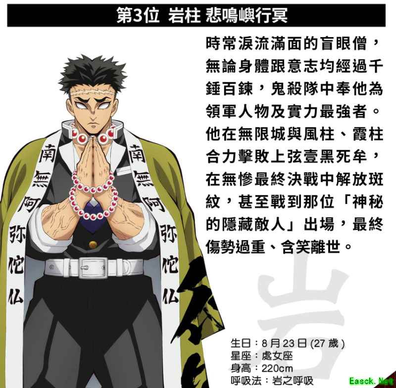 他是九柱的“定海神针”。时常泪流满面的盲眼僧,使用「岩之呼吸」,日轮刀设计与别不同,失明的他很早就精通「透明的世界」,鬼杀队中「九柱」公众他是领军人物,也公认最强。