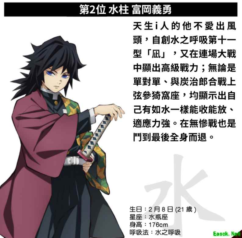 大战黑死牟、最终战解放斑纹时他始终在最前线,最终伤势过重、含笑离世。 第2位:水柱 富冈义勇战功:与炭治郎合力击败上弦参猗窝座/力战无惨全身而回