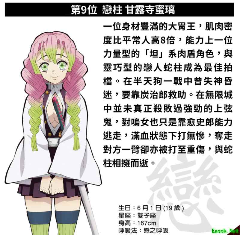 pid77615528▲ 成功直接或间接击杀上弦鬼,名次始终会高一点。整个「排名」仅为提出话题,仅供参考。 第9位:恋柱 甘露寺蜜璃战功:参与原上弦肆半天狗之战.与蛇柱合战新上弦肆鸣女.于无惨最终战身亡