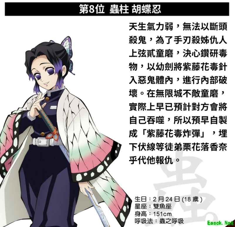 pid89914975▲ 在无限城与蛇柱并肩作战,最后两人相拥殉战。 第8位:虫柱 胡蝶忍战功:牺牲自己埋下伏线.引导徒弟香奈乎击杀超强敌上弦贰童磨