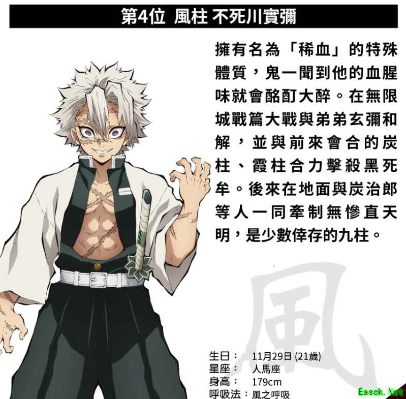 他没来得及爆纹,就已经做到如此。若能多一些时间,这份排名一定不止第五。 第4位:风柱 不死川实弥战功:与霞柱、岩柱合力击败上弦壹黑死牟/力战无惨全身而回
