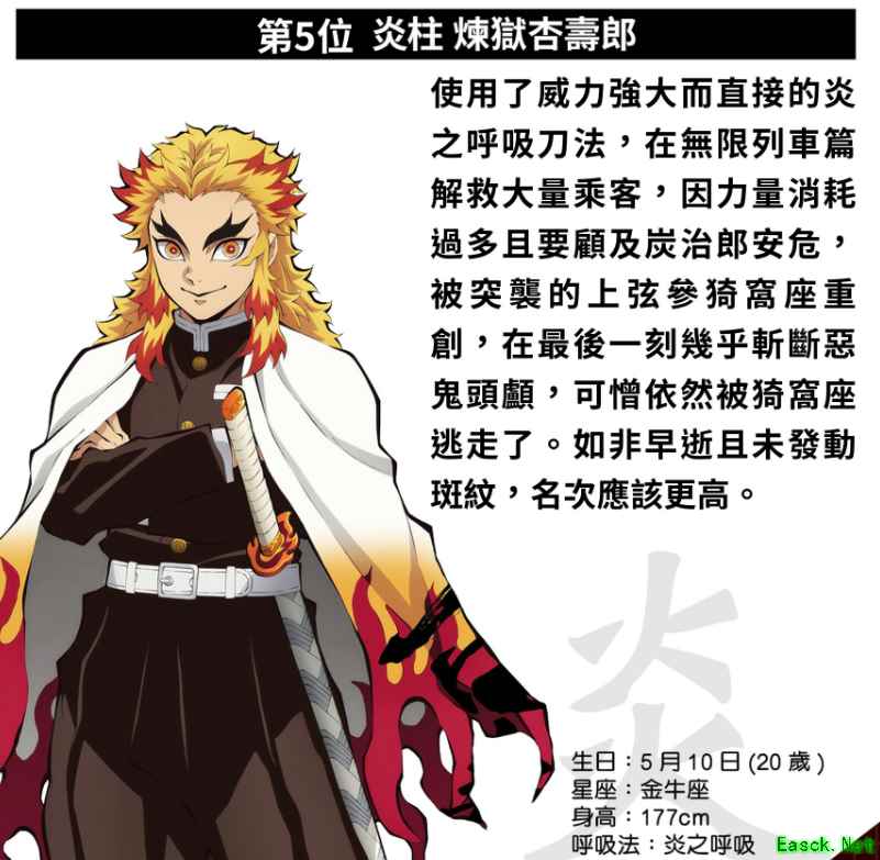 第5位:炎柱 炼狱杏寿郎战功:独力与上弦参猗窝座战至最后力尽身亡.惜被对方逃走