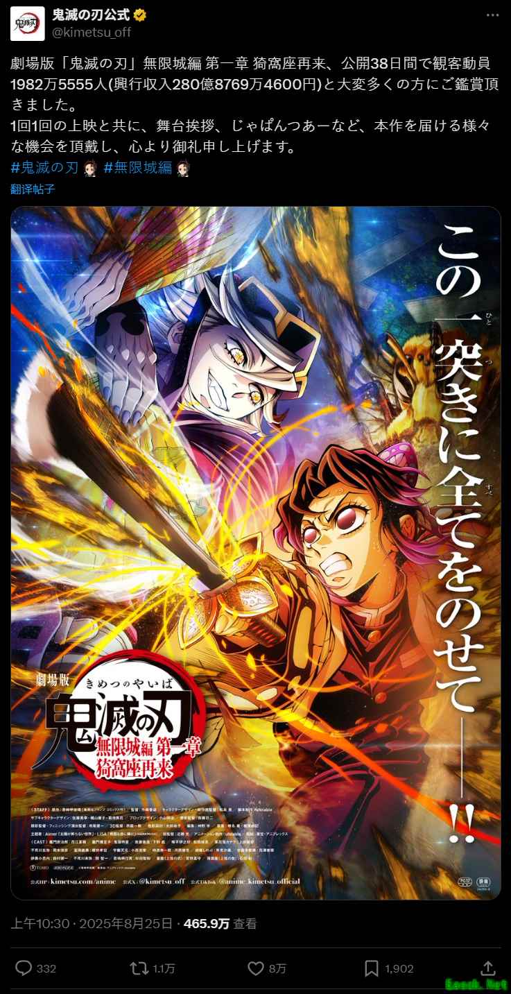 剧场版《鬼灭之刃 无限城篇》第一章一路狂飙。上映38天,票房冲到280亿8769万日元,把《泰坦尼克号》挤下去后稳坐日本影史第3的位置。