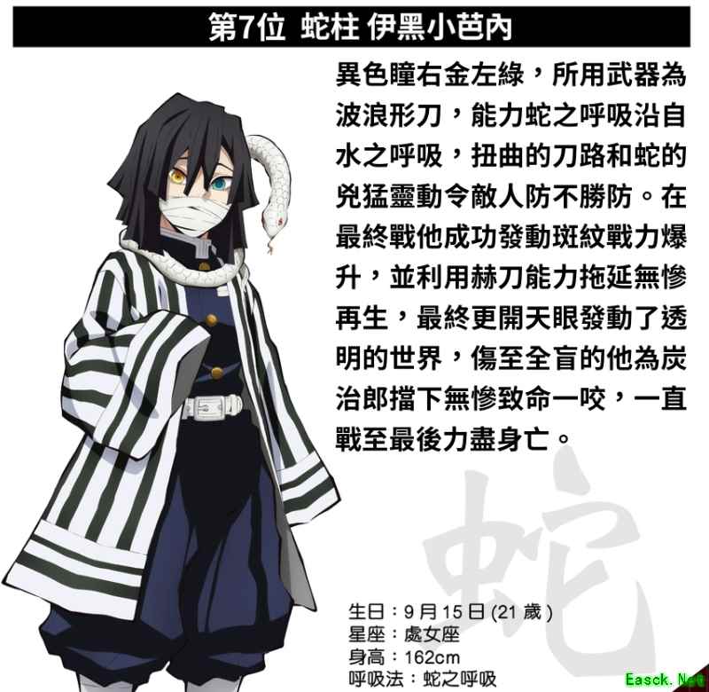 第7位:蛇柱 伊黑小芭内战功:与恋柱合力大战新上弦肆鸣女.于无惨最终战身亡